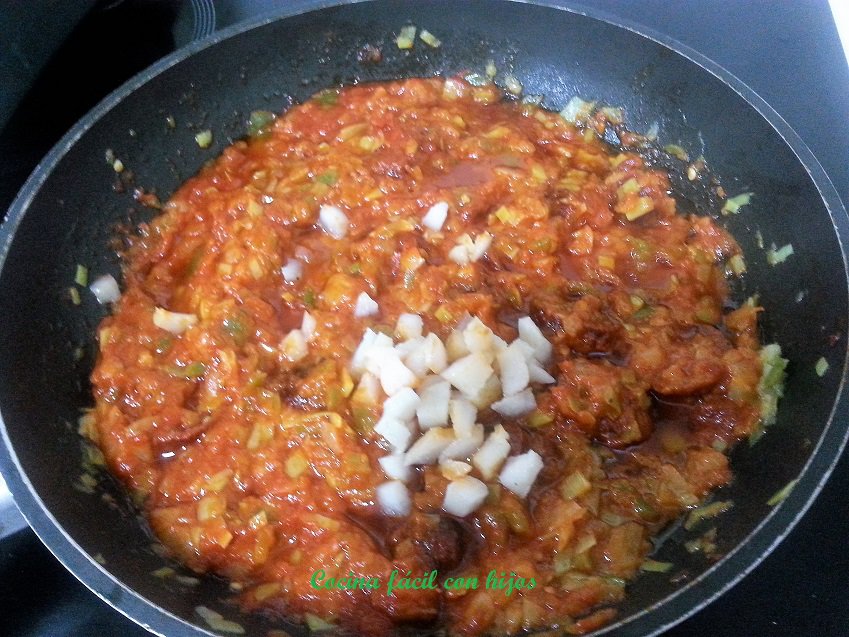 - Llevamos nuevamente el sofrito a la sartén y lo ponemos a fuego medio.