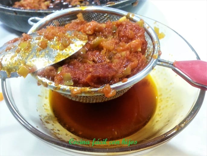 - Colamos el sofrito, para separar el aceite, ya que vamos a usar parte de este aceite para elaborar la masa de la empanada