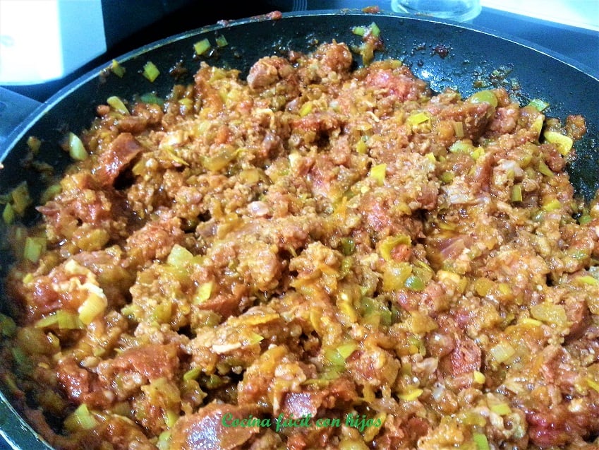 - Agregamos la carne picada. rectificamos de sal y añadimos el vino.Rehogamos durante unos minutos para que coja color (tened en cuenta que luego vamos a llevar la empanada al horno durante unos 30 minutos, y si nos pasamos la carne quedaría dura).