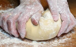 - Empezamos a trabajar con fuerza presionando con los dedos de dentro hacia fuera. Durante 7 minutos. Dejamos que la masa repose 5 minutos.