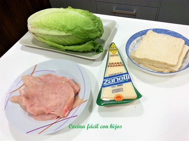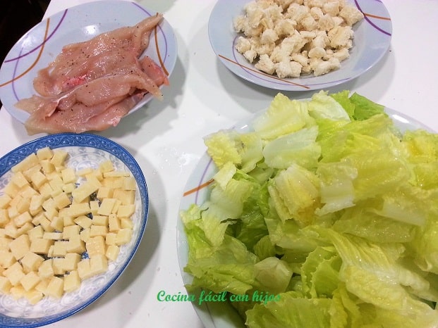 Los ingredientes no pueden ser más sencillos y económicos: lechuga romana, queso parmesano y picatostes.