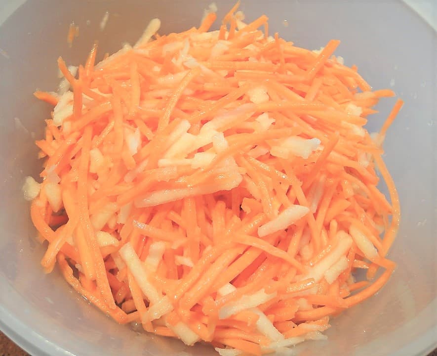 • Lavamos las verduras, las pelamos, rallamos la zanahoria y la manzana.