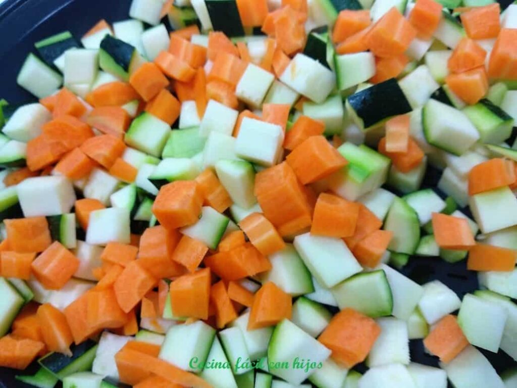 - Lavamos las verduras, raspamos las zanahorias y cortamos ambas en cuadraditos que vamos a cocer al vapor,