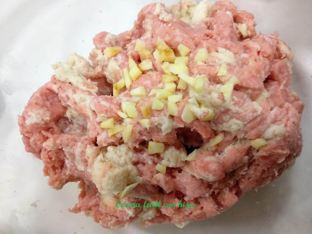 - Mientras se cuecen las verduras picamos el ajo y lo echamos a la carne picada, que hemos metido en un bol.