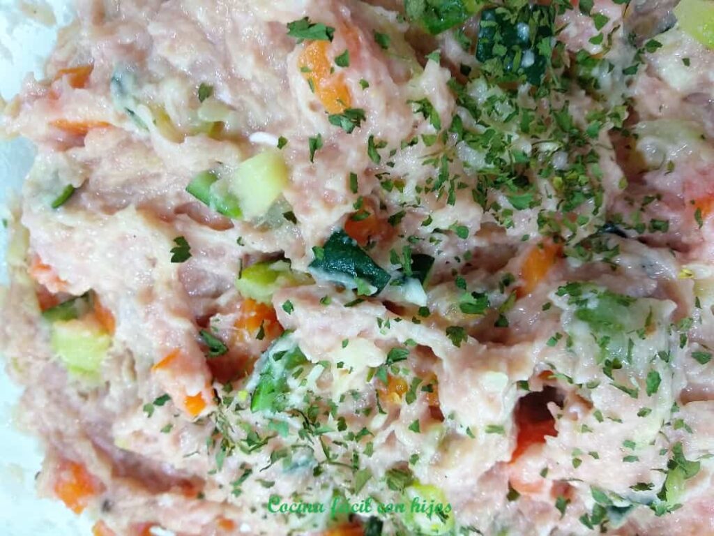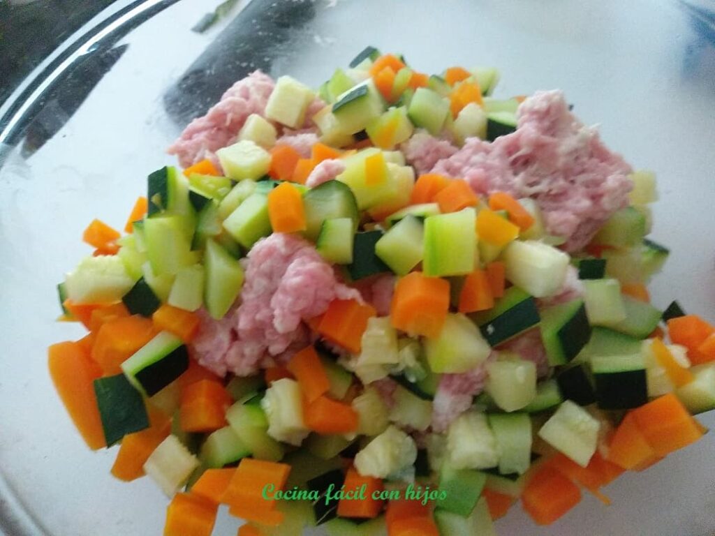 - Cuando las verduras ya están cocidas y frías las añadimos a la carne picada.