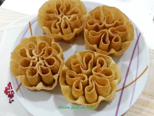 Cuando comience a dorarse se desprenderá la flor del molde con facilidad, si no lo hace lo sacudimos un poco. Dejamos el molde dentro del aceite caliente mientras se fríe la flor, para que no pierda temperatura