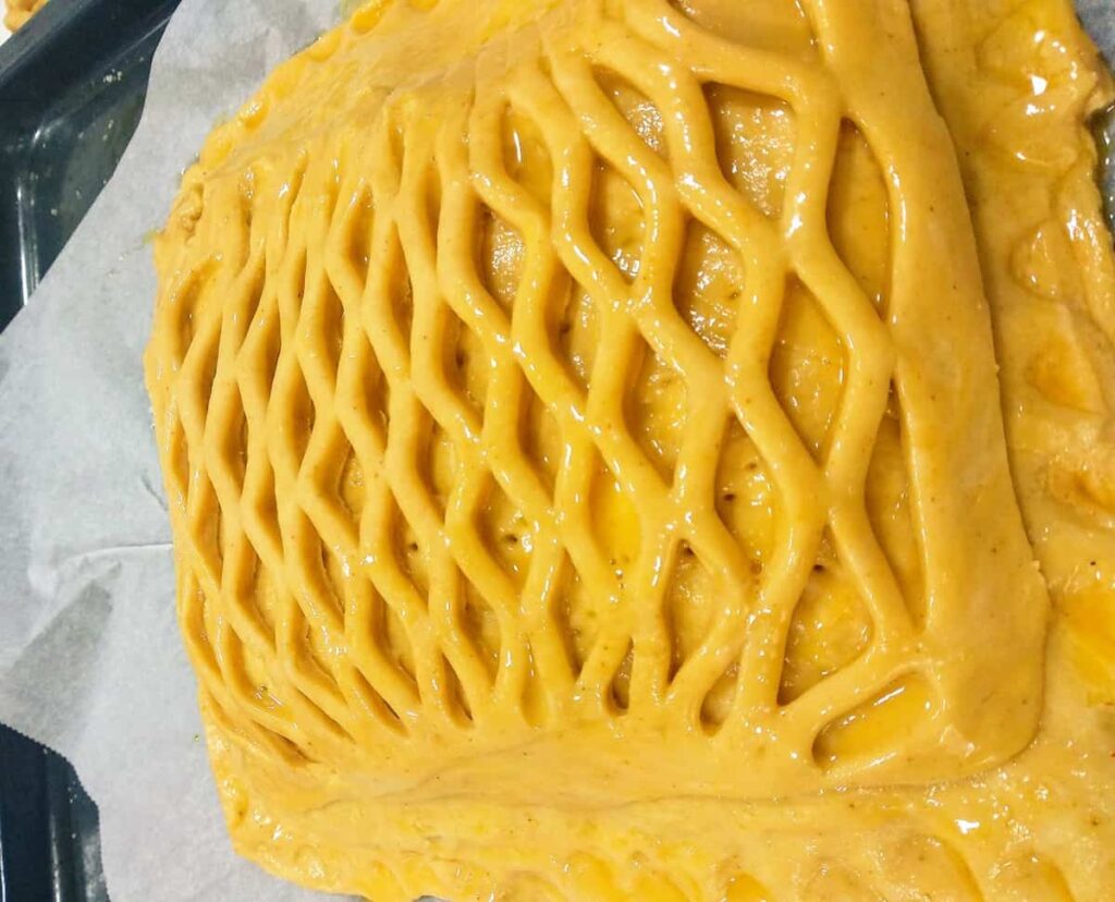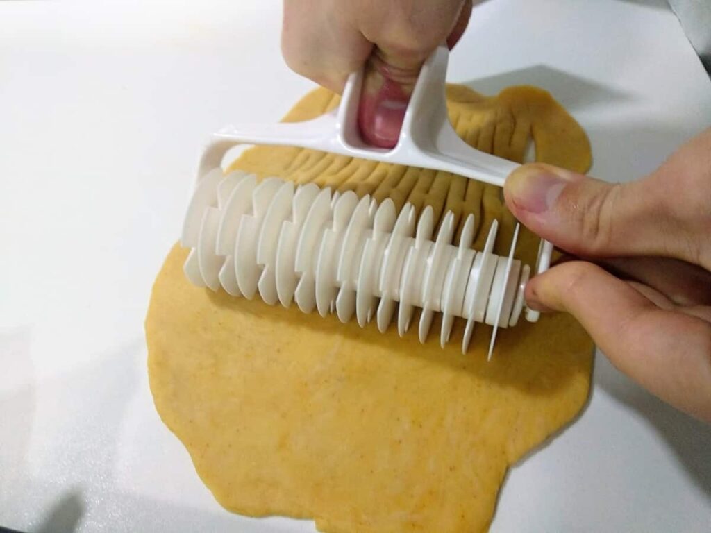 • Estiramos el trozo pequeño de masa, con ayuda de un rodillo. hasta tener un rectángulo, y con ayuda de un rodillo hacemos la rejilla, que extendemos sobre el hornazo