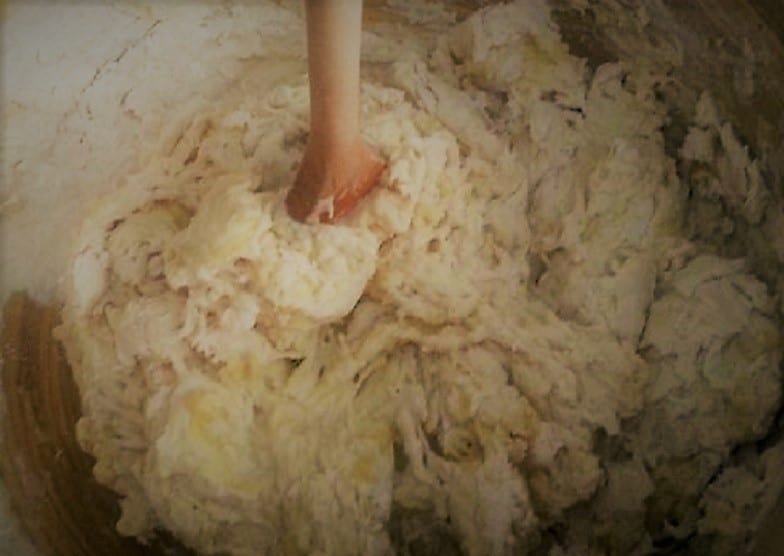 • Calienta el vino con el agua, templando la mezcla y agrega la manteca de cerdo. Mezcla bien hasta que se disuelva todo, añade la levadura disuelta y vuelve a mezclar