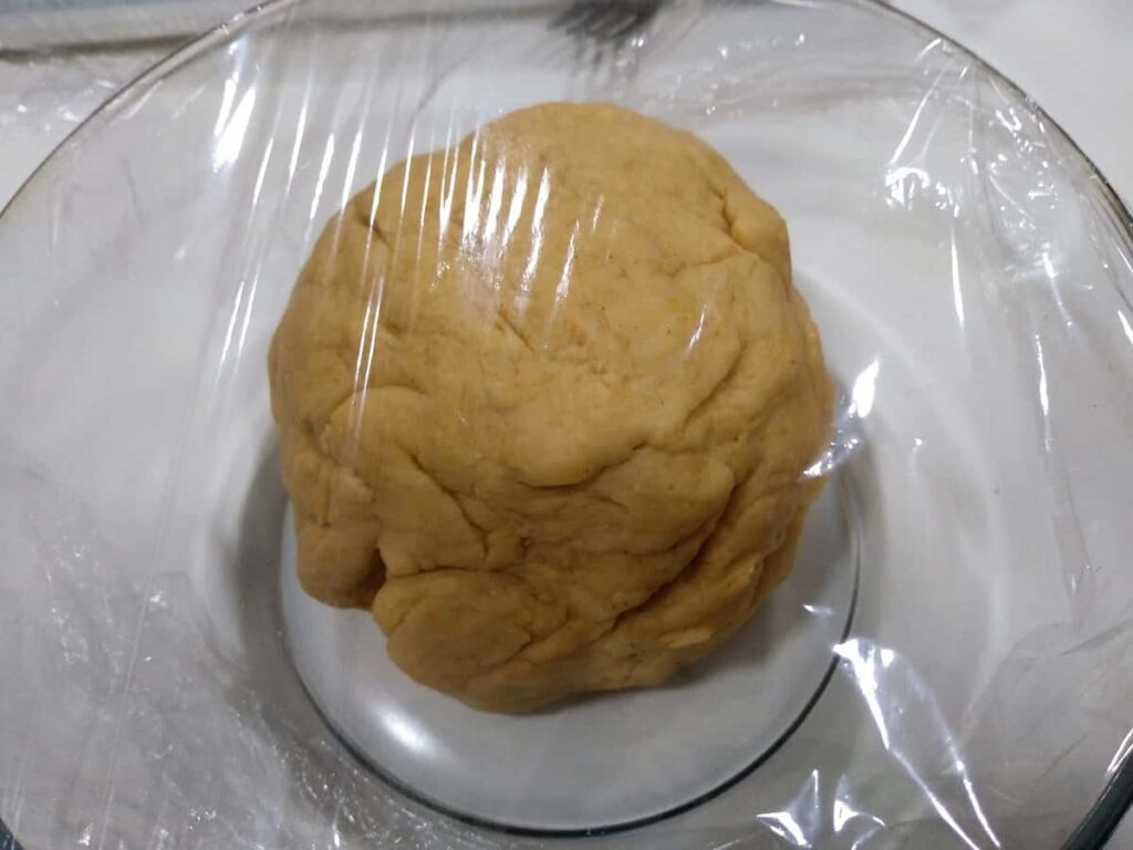 • Formamos una bola, la ponemos en el bol y tapamos con papel film y dejamos reposar durante 30 minutos.
