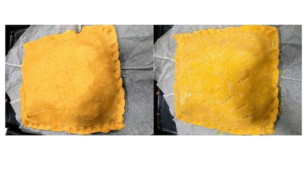 • Estiramos el otro trozo de masa, con ayuda de un rodillo de cocina y lo colocamos encima, tapando el relleno, unimos los bordes, dejando espacio para sellar la masa. Recortamos el sobrante.