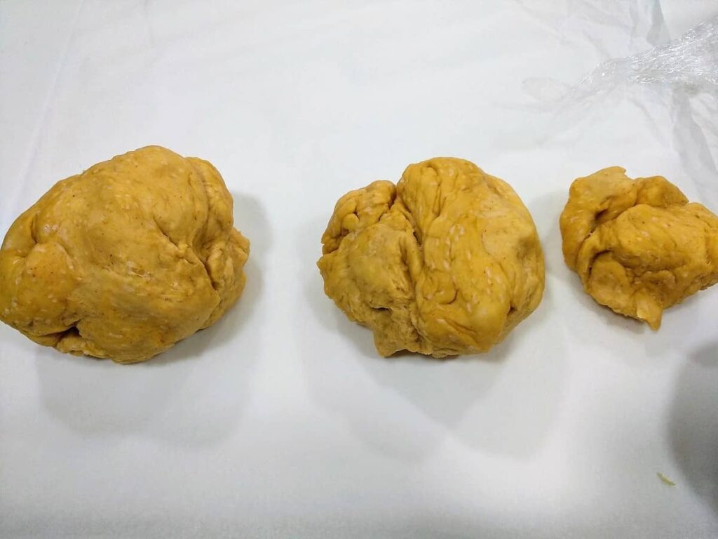 • Dividimos la masa en tres trozos de tres tamaños, uno grande, otro un poquito más pequeño y otro pequeño. ¿Por qué?, la base tiene que ser un poco más gruesa porque va a soportar todo el peso y la humedad de los ingredientes.