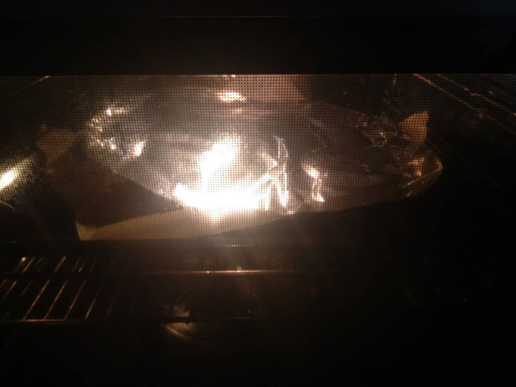 • Cuando veamos que el hornazo, ya está suficientemente dorado, si no ha terminado el tiempo de cocción lo tapamos con papel de aluminio, para que no se nos queme la superficie.
