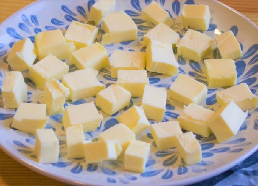 • La mantequilla se funde a los 30 o 32 grados, la forma más simple de hacerla es cortarla en cuadraditos y mantenerla a temperatura ambiente unos 15 minutos si es verano, o en un bol metálico encima de un radiador si es invierno.