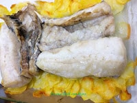 • Pasado este tiempo sacamos la bandeja, separamos las patatas en dos partes, para dejar espacio a la merluza en el centro.