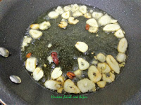 • En una sartén pequeña ponemos 50 ml de aceite de oliva, añadimos las láminas de ajo en frío y las cayenas (la cantidad de cayena al gusto, según nos guste más o menos picante).