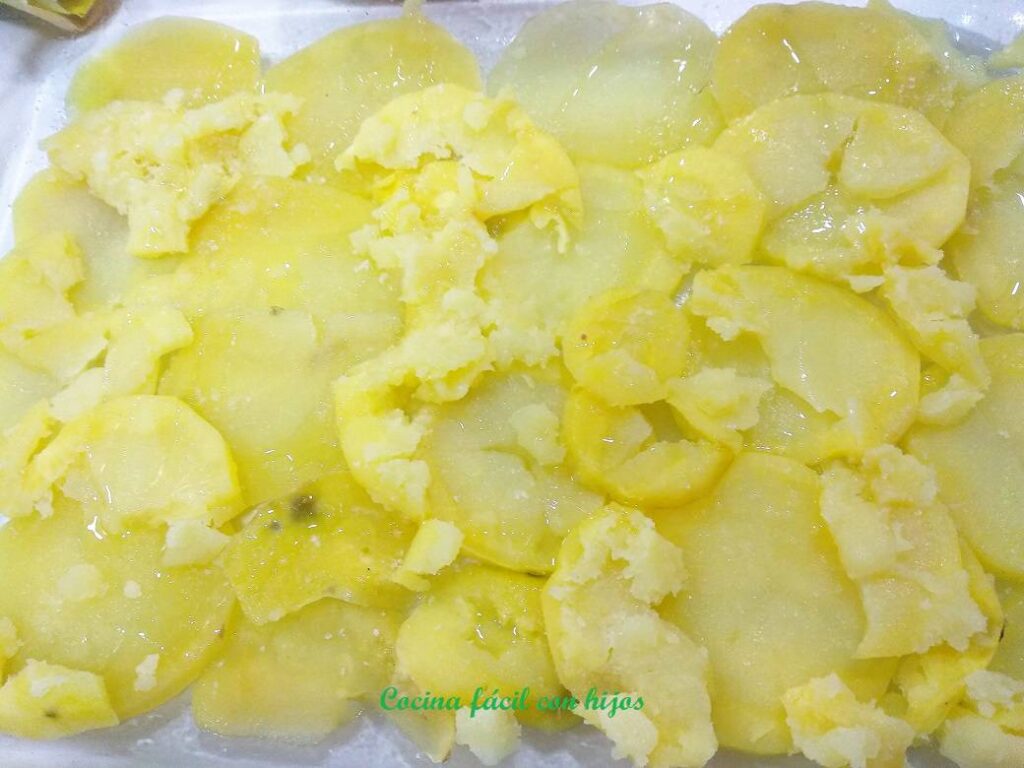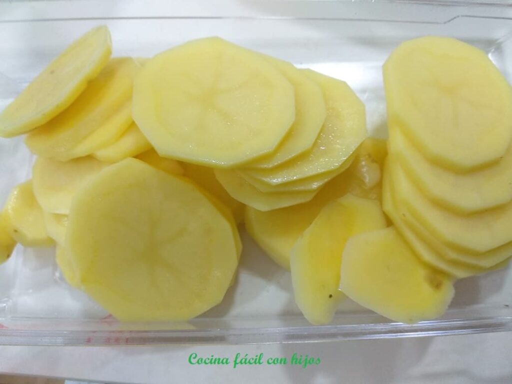 • Pelamos las patatas y las cortamos en rodajas finitas, hacemos lo mismo con los calabacines, pero estos sin pelar. El uso de la mandolina nos ahorra tiempo