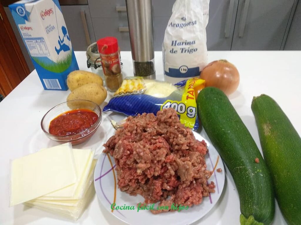Se prepara en capas como la lasaña, en este caso tres: patatas, rodajas de calabacín y carne picada,