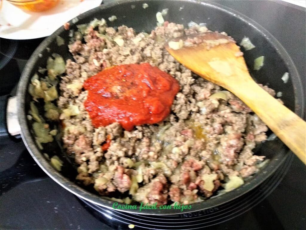 • Salpimentamos la carne y cuando la cebolla empiece a tomar color, añadimos la carne y la rehogamos, desmenuzándola bien.