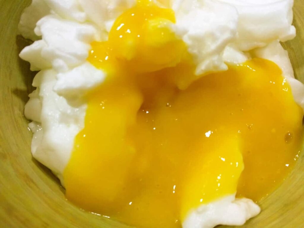• Ponemos en un bol la clara a punto de nieve y vamos incorporando el puré de mango y lo mezclamos con movimientos envolventes con mucho cuidado.