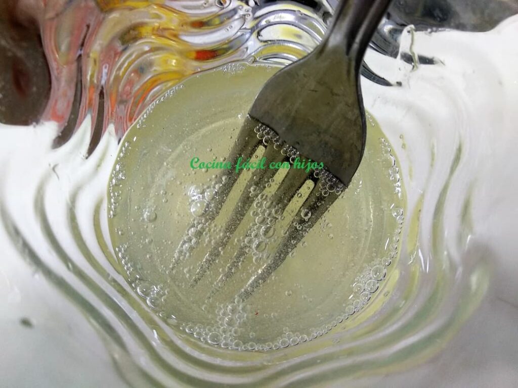 • Como la vamos a utilizar en un plato frío, tenemos que meterla en un recipiente con 100 ml. de agua caliente y removemos hasta que quede completamente disuelta.