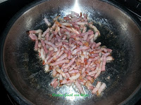 • Mientras se cuece la pasta, en una sartén a fuego medio, ponemos una cucharada de aceite de oliva y cuando está caliente añadimos el bacón y los sofreímos.