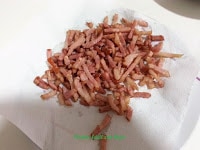 • Cuando el bacón, está hecho lo ponemos en un plato con papel de cocina absorbente para retirar el exceso de grasa