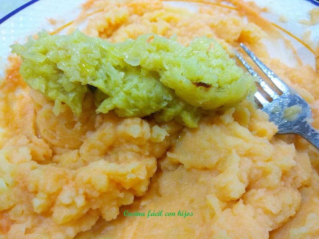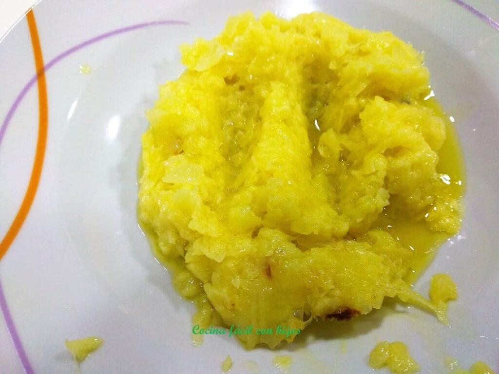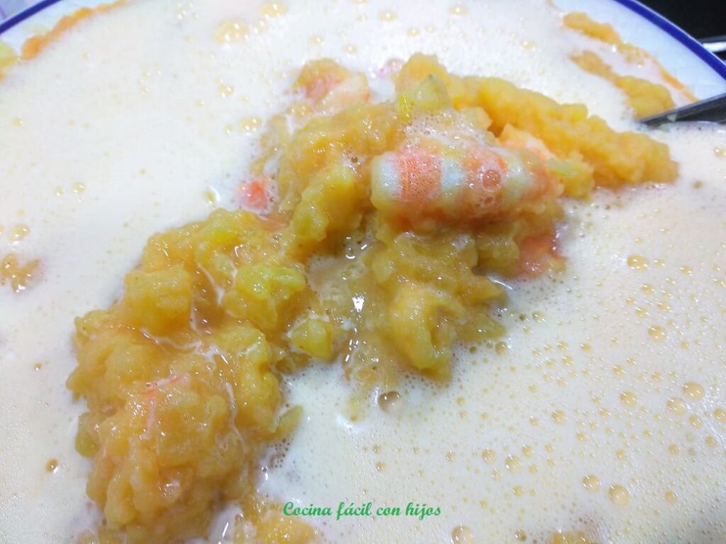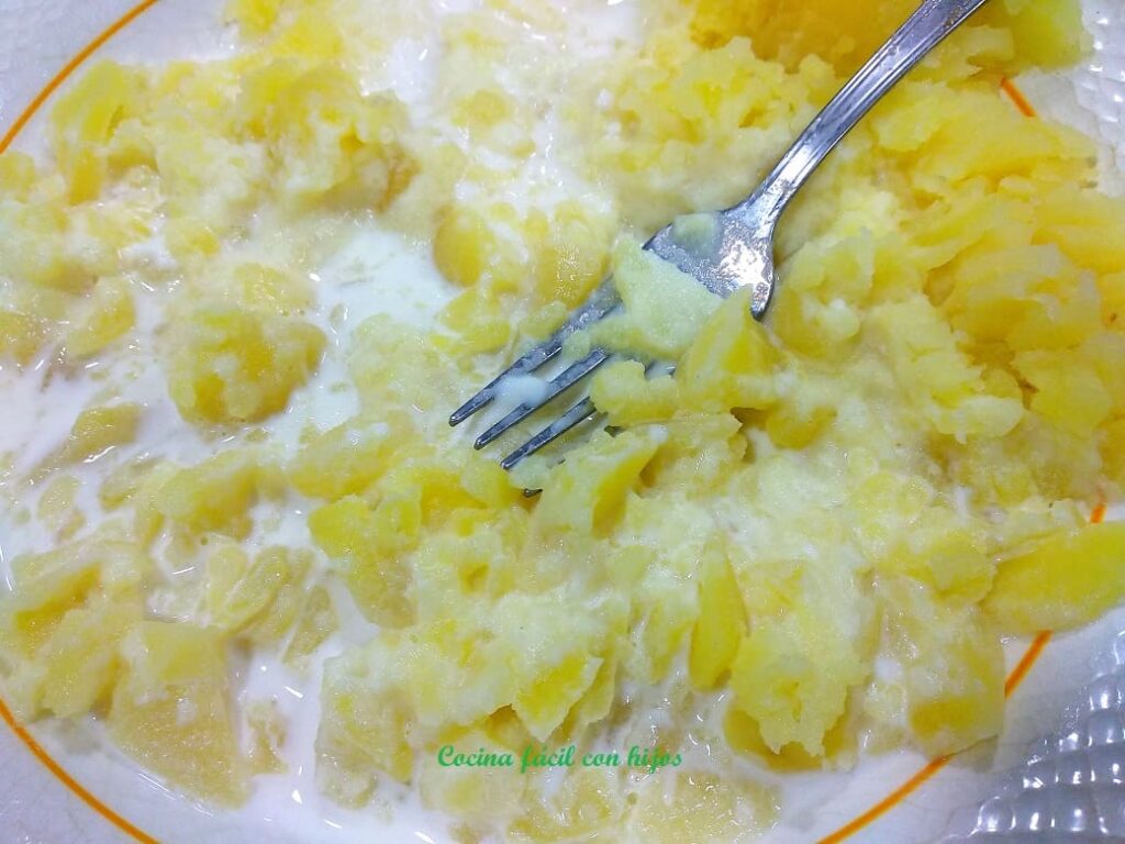 • Con un tenedor aplastamos las patatas, incorporamos la nata, la leche y removemos.