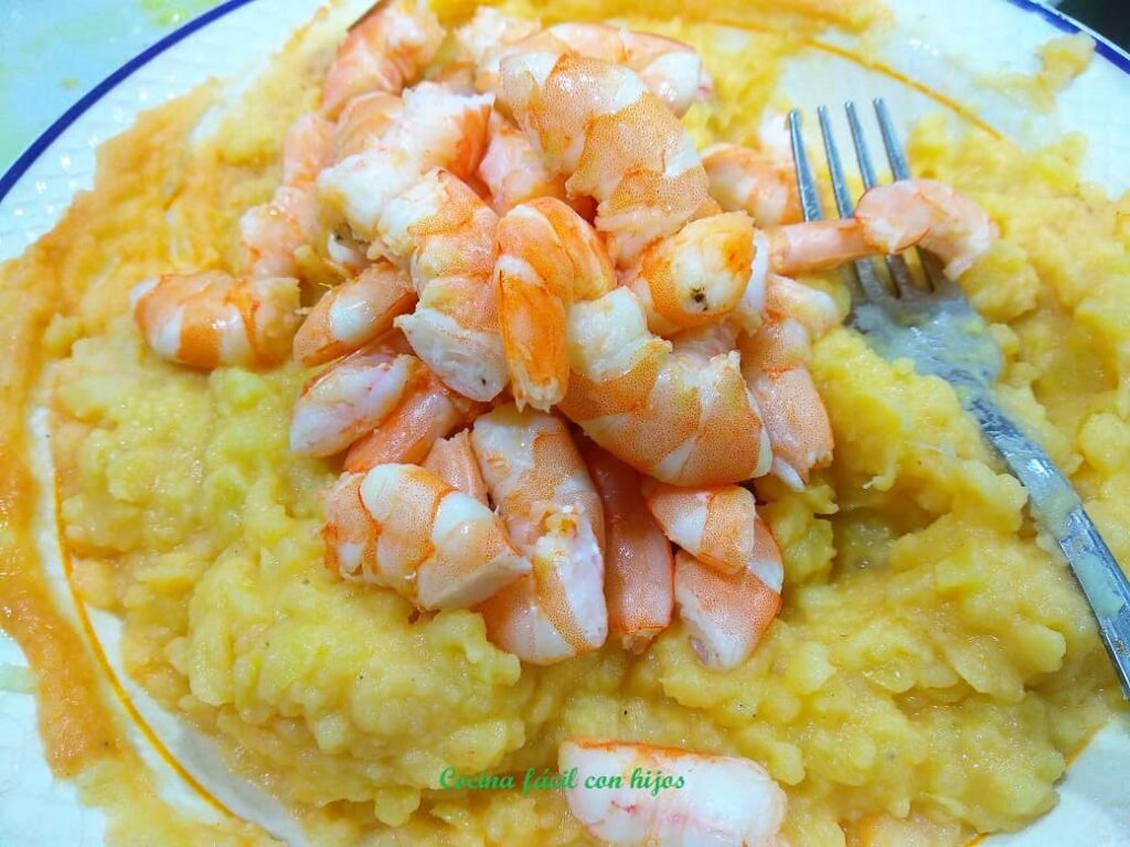 • Reservamos unos 12 langostinos para decorar. Añadimos el resto, si son muy grandes, partidos por la mitad.