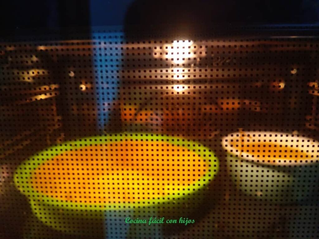 • Lo llevamos al horno previamente calentado a 180 º, lo mantenemos durante unos veinte minutos aproximadamente. Pero como cada horno es diferente, lo mejor es abrir el horno y comprobar que está hecho.