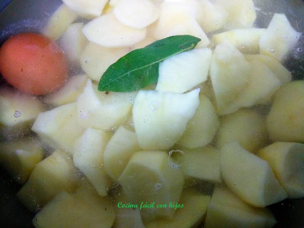 • Pelamos las patatas, las troceamos y las ponemos en una olla a cocer con agua, sal y una hoja de laurel.