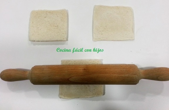 - Aplanamos las rebanadas de pan con un rodillo y las cortamos para que encaje bien en el molde.