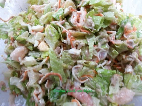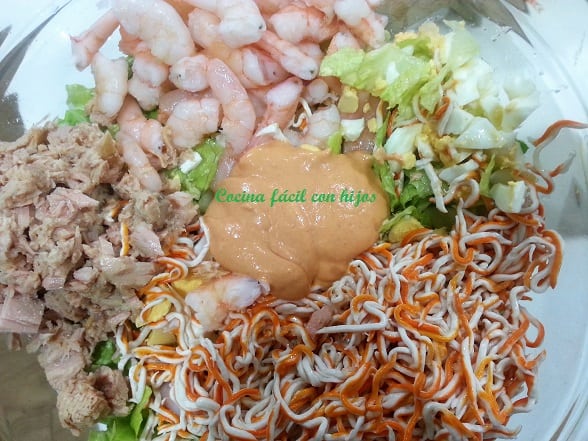 - Lo ponemos en un bol junto al surimi y lo mezclamos con la salsa coktail y la mayonesa.
