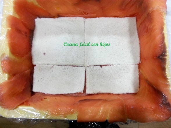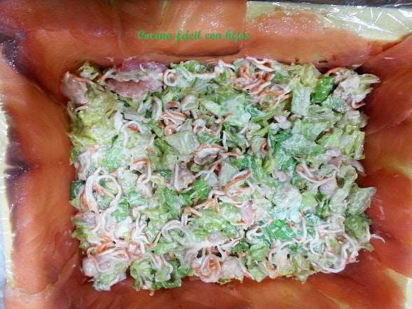 - Ahora lo forramos nuevamente, pero con las lonchas del salmón, sin que quede ningún hueco. Si sobra salmón lo picamos y lo añadimos al relleno.