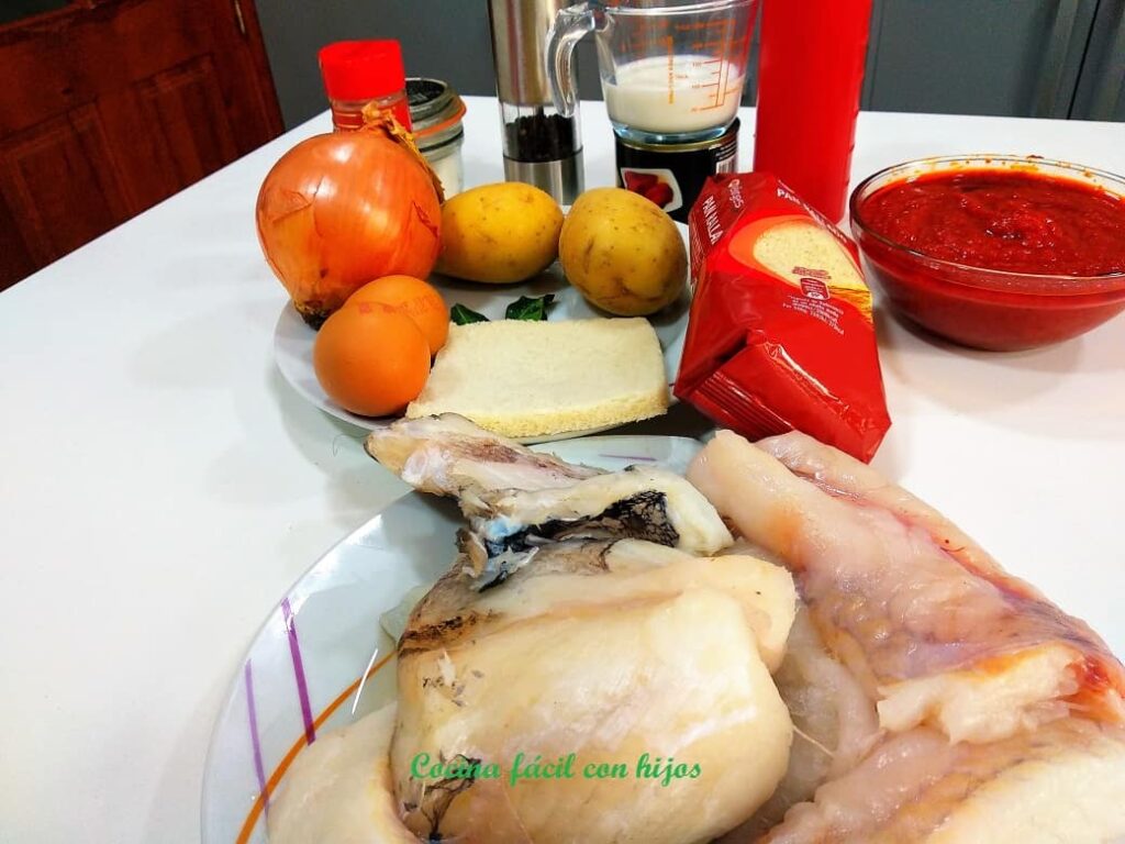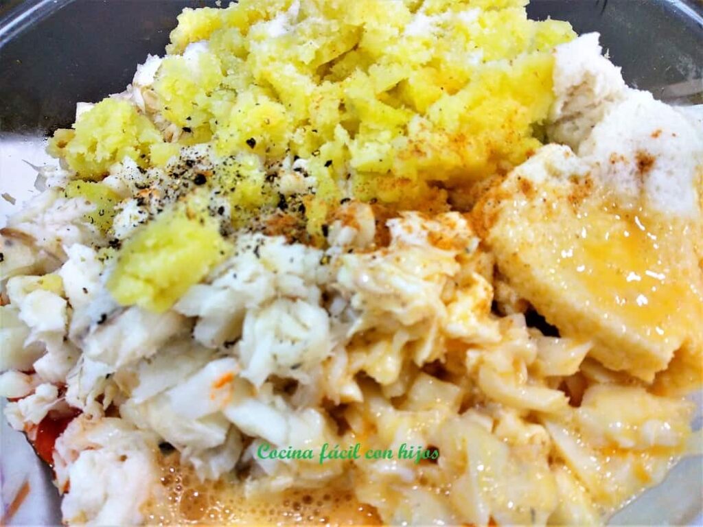 - En un bol grande mezclamos; el pescado, la salsa de tomate con cebolla y pimientos, el pan bien escurrido, los huevos batidos, el puré de patatas, la sal, la pimienta y la nuez moscada.