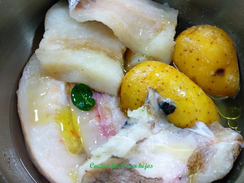 - Ponemos en una olla el pescado y las patatas con piel, lo cubrimos con agua, añadimos sal, laurel y un poquito de aceite y lo ponemos a cocer. En olla exprés 20 m.