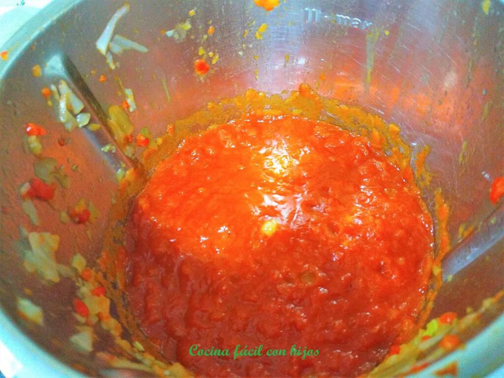 - Picamos la cebolla y la freímos con un poco de aceite, añadimos el tomate frito y los pimientos bien picaditos, lo dejamos a fuego medio unos 6 minutos.