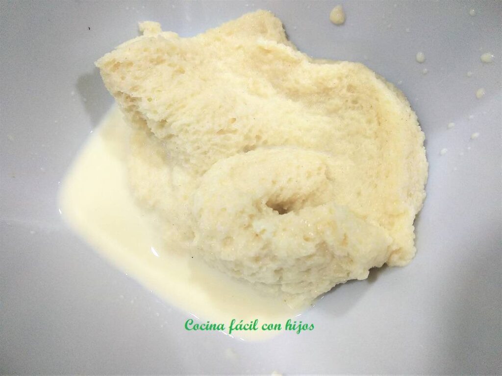 - Dejamos la rebanada de pan de molde en un plato y la echamos la leche por encima, la dejamos hasta que esté bien empapada.