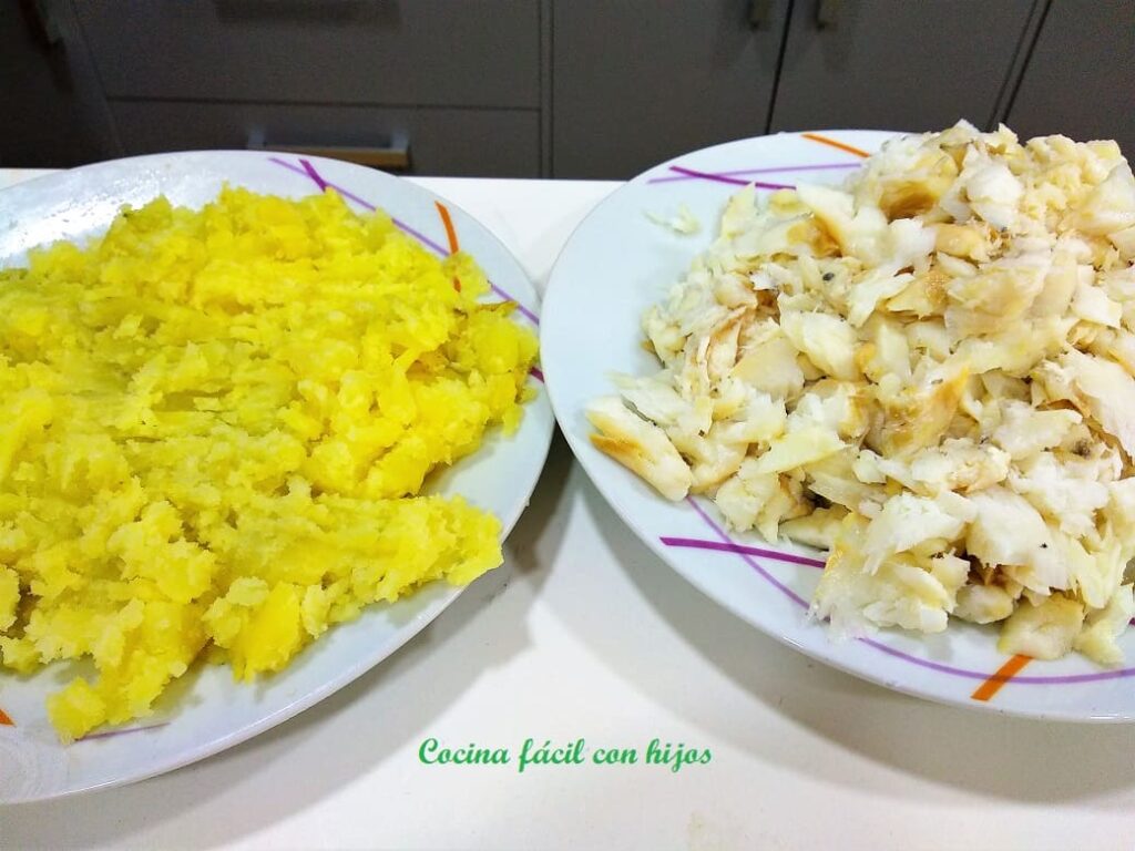 - Quitamos la piel a las patatas y hacemos un puré con ayuda de un tenedor.