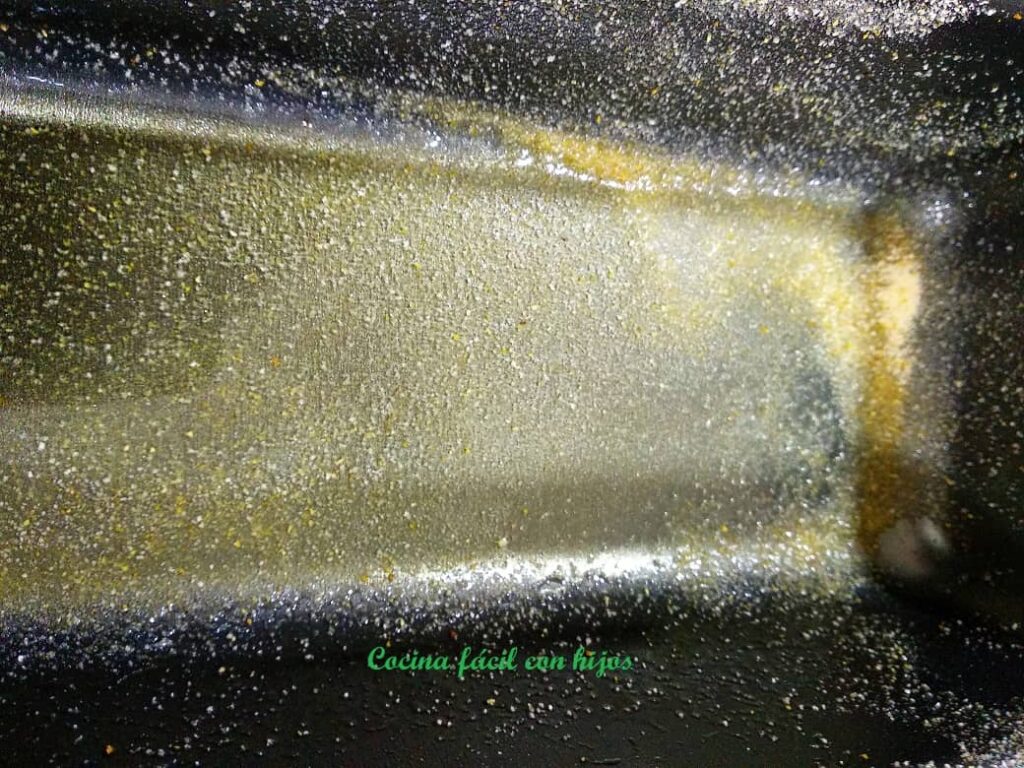 - Untamos un molde alargado, tipo plumcake con aceite y lo espolvoreamos con pan rallado.