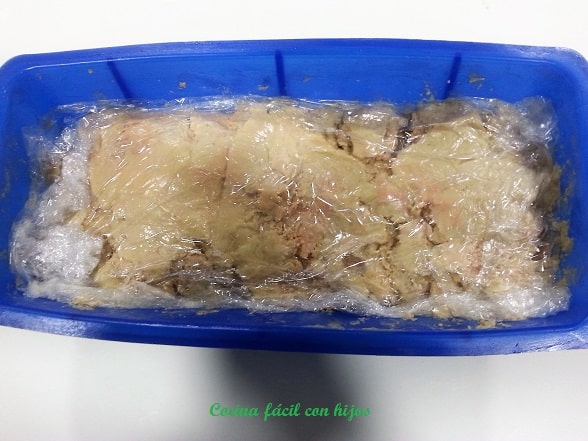 - Después lo metemos en el frigorífico con un peso encima, puedes utilizar un brik de leche, durante un mínimo de 12 horas.