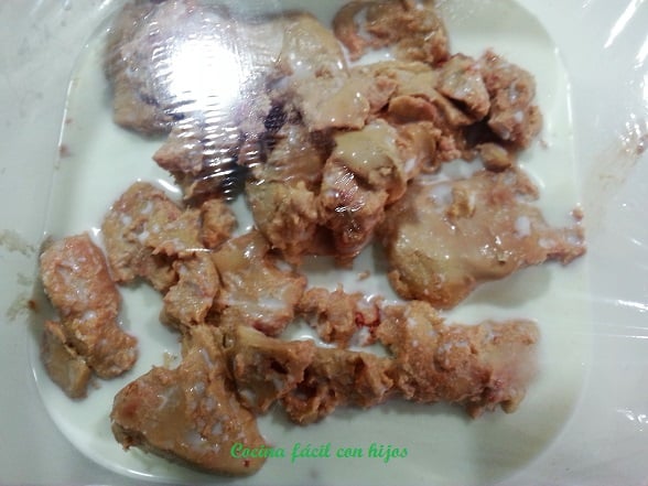 - Cuando no se tiene experiencia cuesta un poco, pero hay un truco; para asegurarnos que hemos quitado todas las venas sumergimos el hígado en leche durante 6 horas, tapamos el recipiente con papel film y lo metemos en el frigorífico.