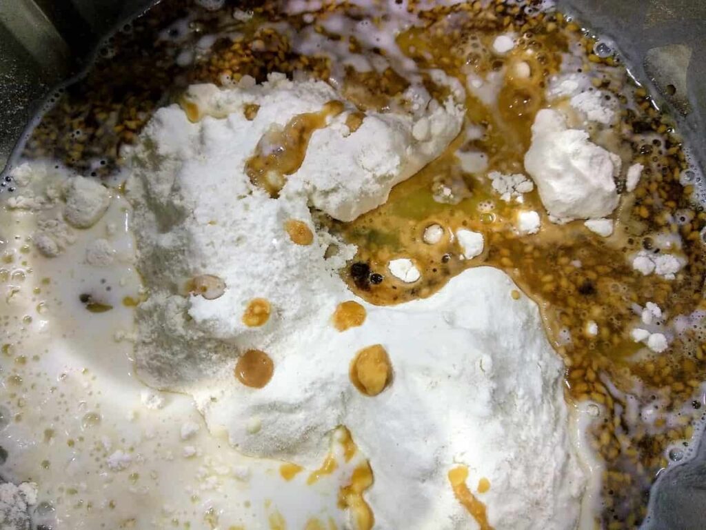 - Disponemos en un cuenco la harina formando un volcán y verter el aceite anterior, ya frío.