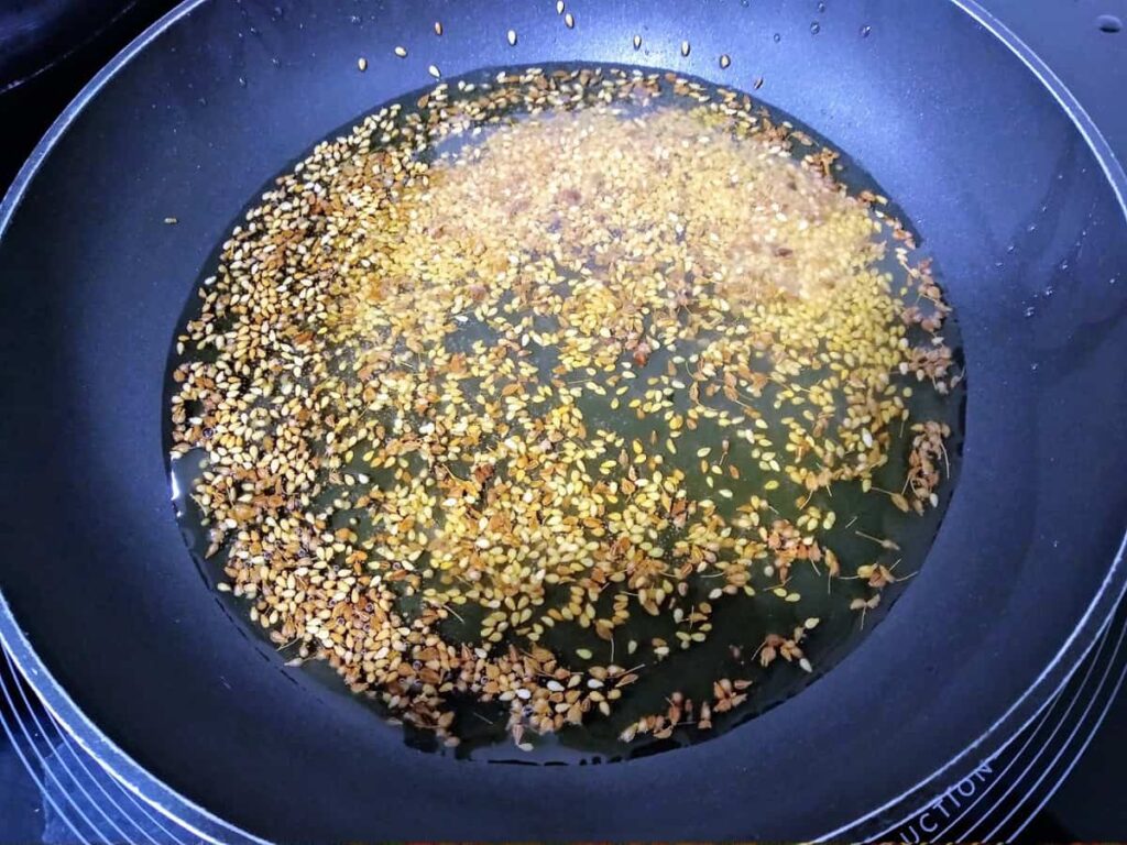 - Calentamos en una sartén el aceite con la cáscara de limón. Cuando comience a dorar la retiramos y quitamos la sartén del fuego e incorporamos el anís y el sésamo.