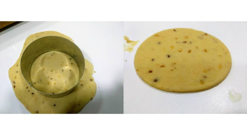 - Cortamos en círculos, cuadrados, o rectángulos, según prefieras. He hecho los círculos con ayuda de un aro de emplatar.