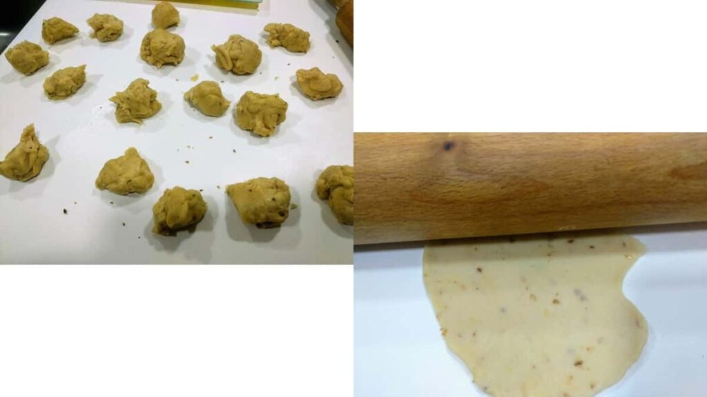 - Dividimos la masa en porciones pequeñas y estiramos cada porción con un rodillo hasta dejarla lo más fina posible.