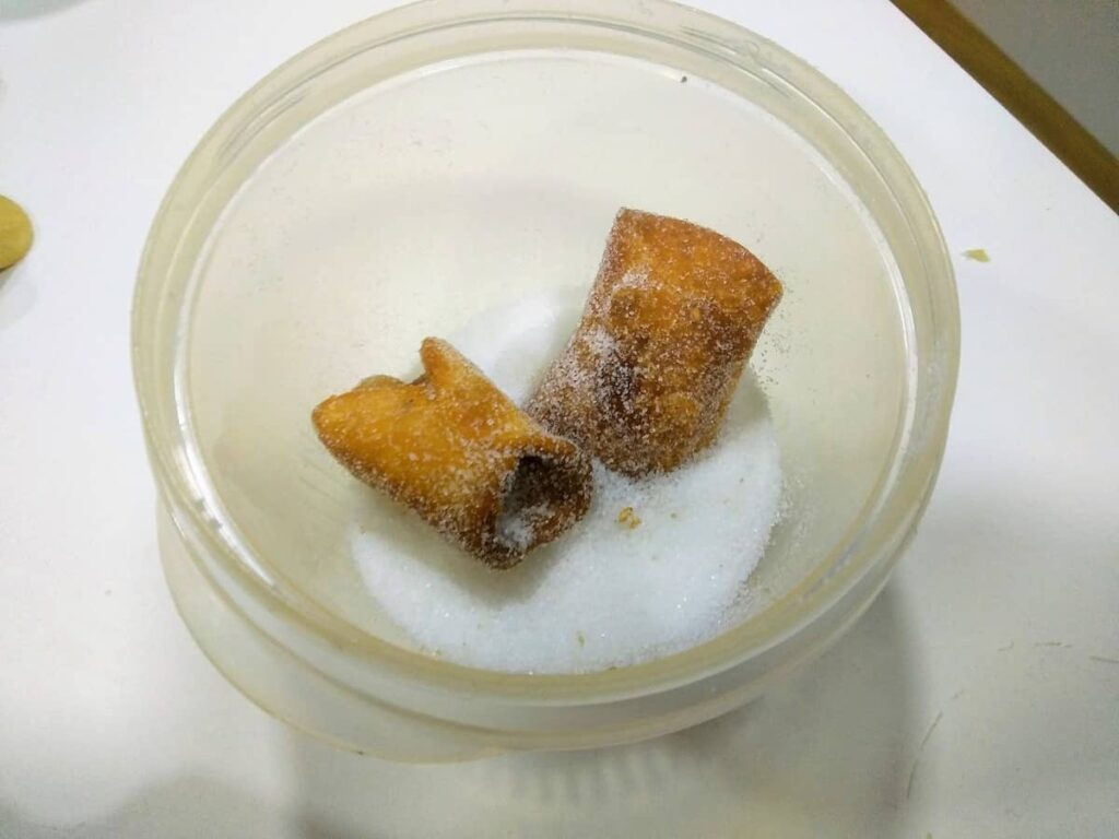 - Ponemos en un cuenco, el azúcar suficiente para rebozar lo pestiños y los pasamos por el azúcar, cuando aún están calientes.