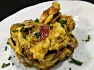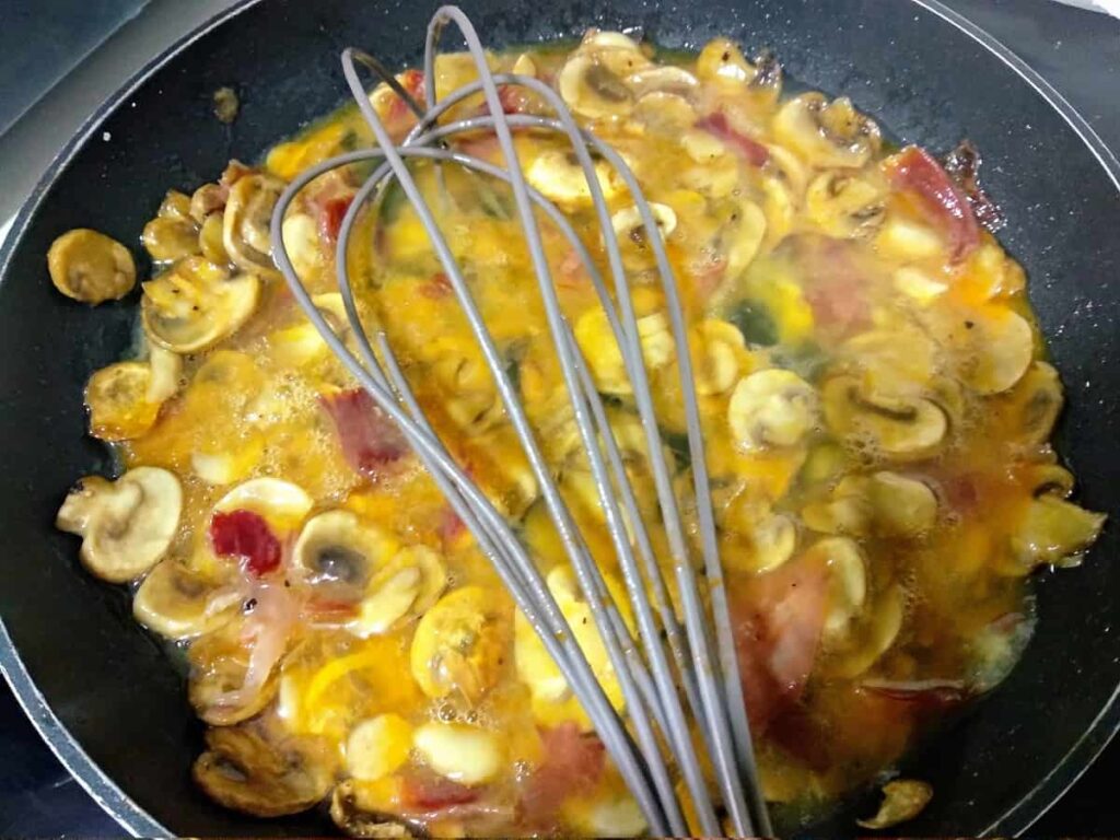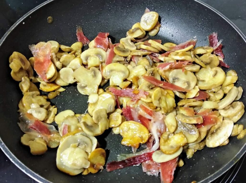 La base de este plato son los champiñones mezclados con huevos revueltos y jamón. Es un plato de cocina muy tradicional, que se puede comer durante todo el año.