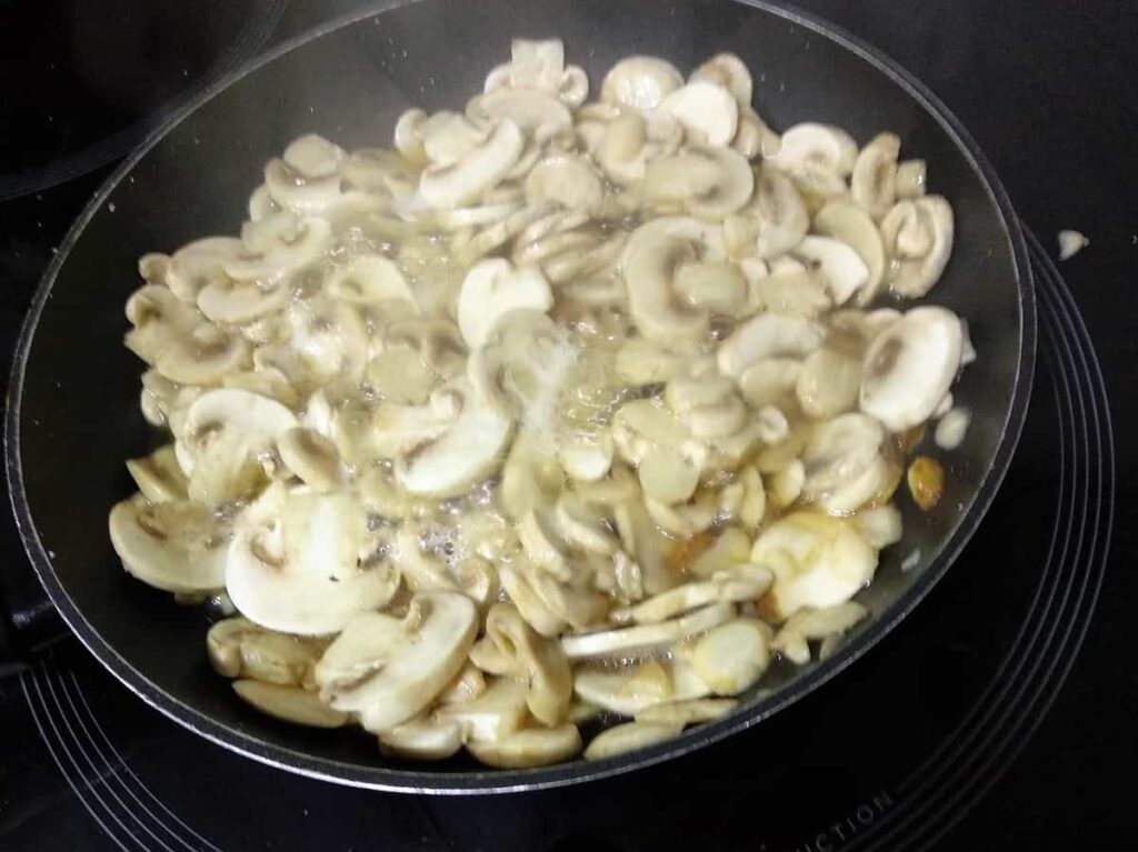 4. Añadimos los champiñones a la sartén y los saltearemos hasta que los champiñones cambien de color y queden un poco brillantes. Tenemos que esperar a que los champiñones suelten toda el agua, sino corremos el riesgo de arruinar el plato.