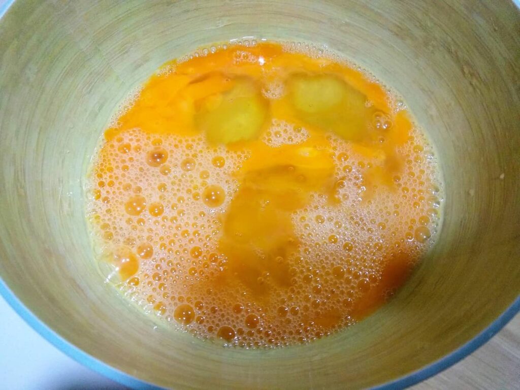 • En un bol, ponemos los huevos con un poquito de sal. Con un batidor manual, los rompemos y revolvemos solo un poco.