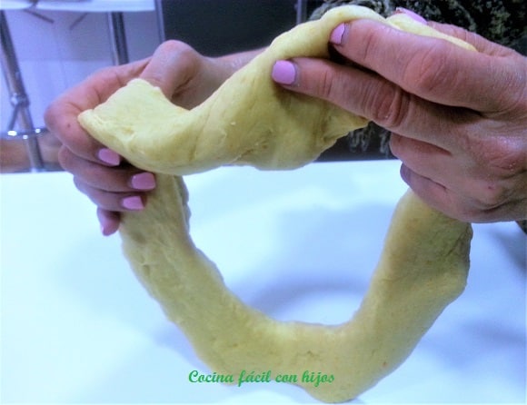 Vamos a trabajar una masa pegajosa, por eso es conveniente engrasarte las manos, cuando la amasas. Tienes que conseguir una masa suave, elástica, blanda y un poquito pegajosa. Sigue amasando hasta que te quede así.